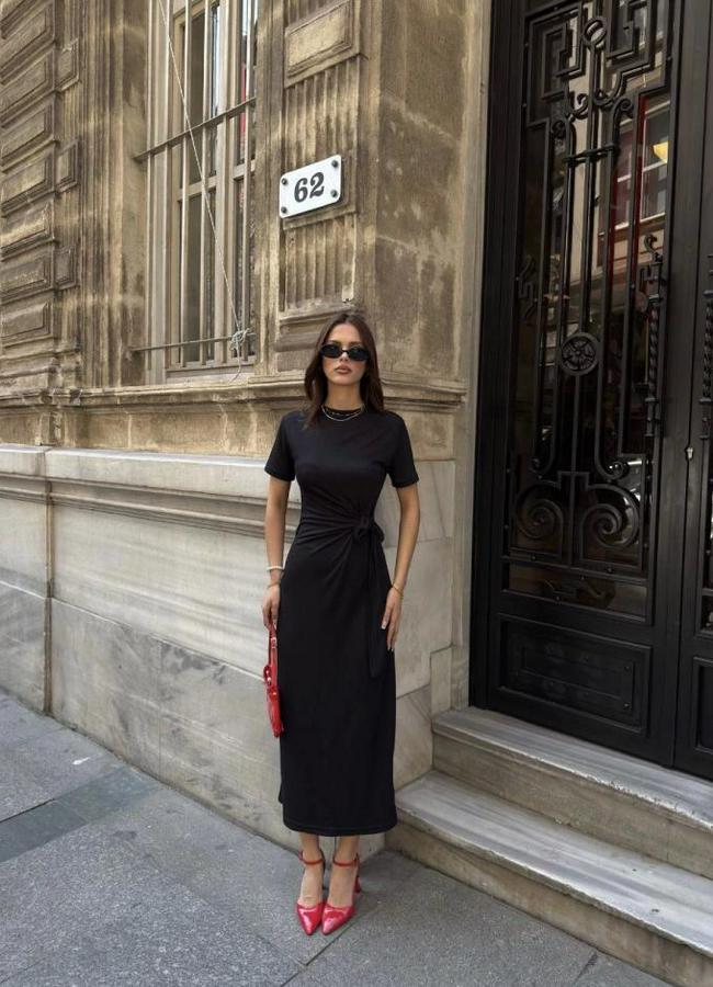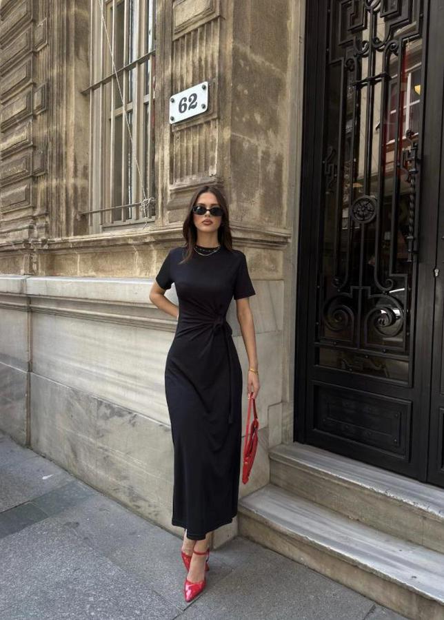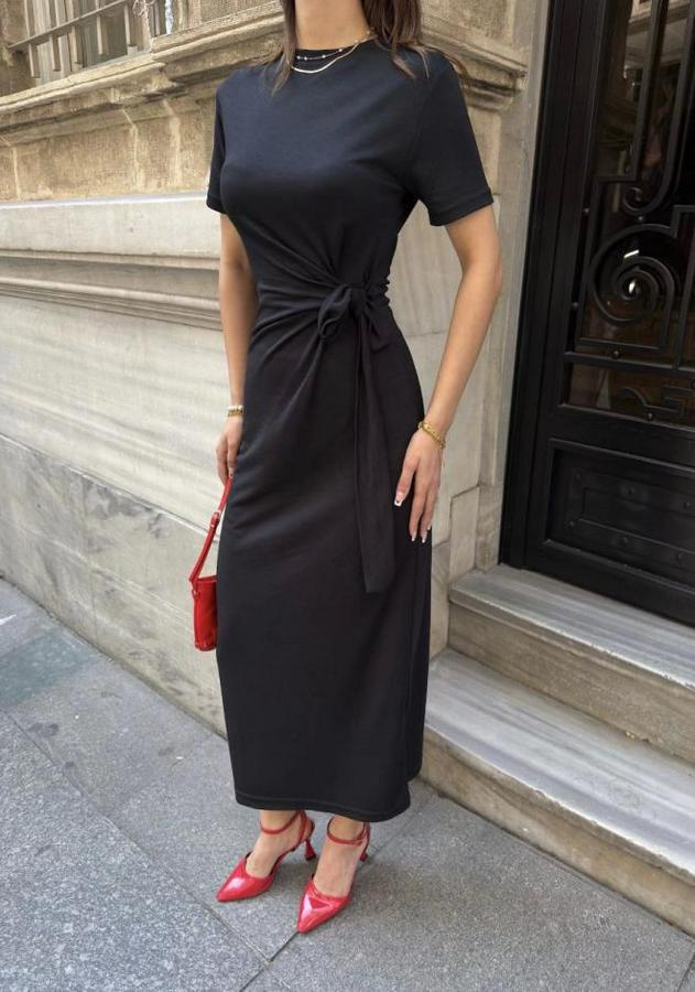 Osy Modal Yumuşak Dokulu Kumaş Bisiklet Yaka Kısa Kollu Kuşaklı Uzun Elbise - Siyah