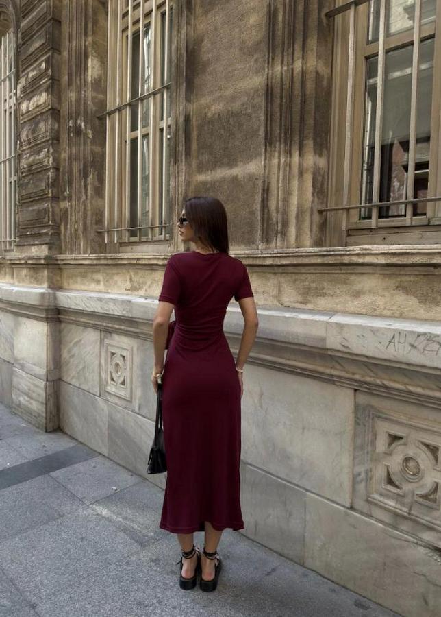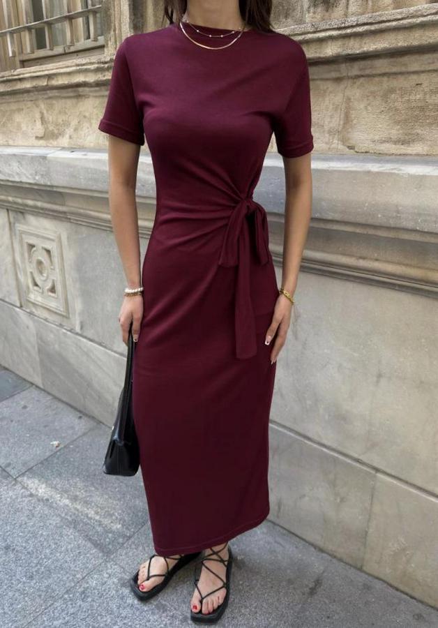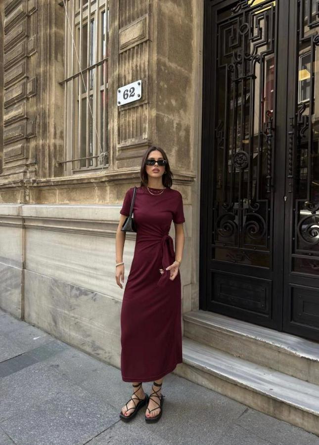 Osy Modal Yumuşak Dokulu Kumaş Bisiklet Yaka Kısa Kollu Kuşaklı Uzun Elbise - Bordo