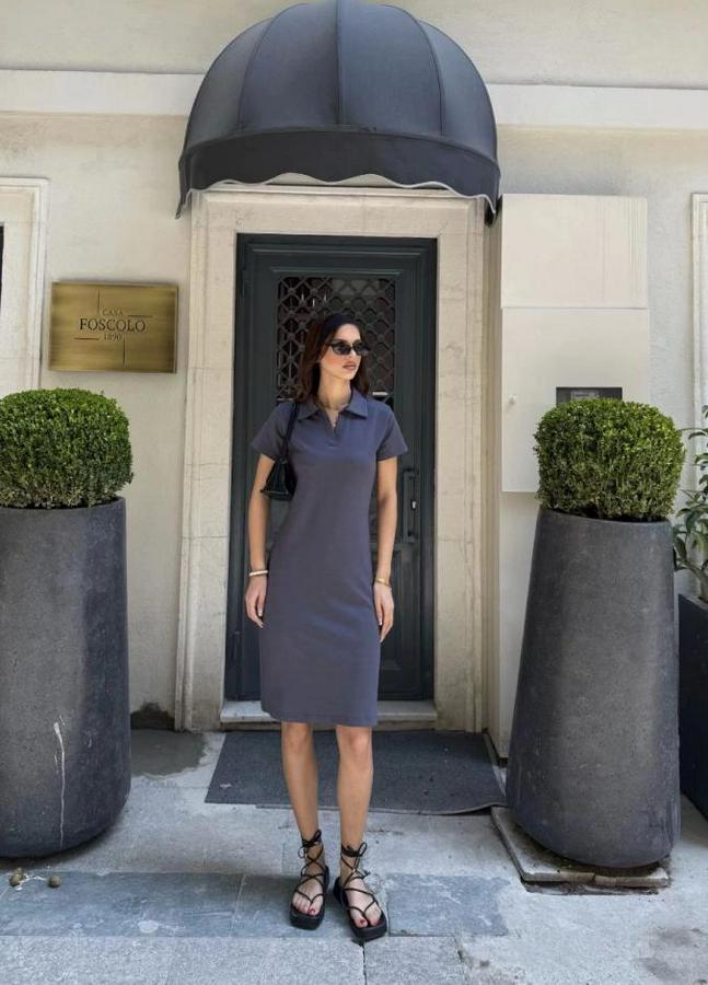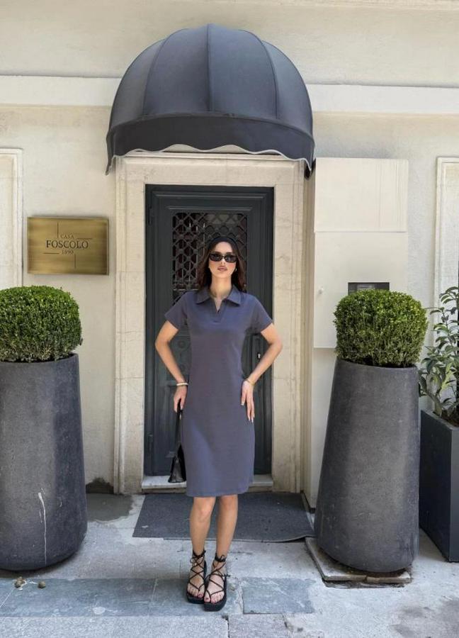 Osy Modal Yumuşak Dokulu Kumaş Yakalı Kısa Kollu Elbise - Füme