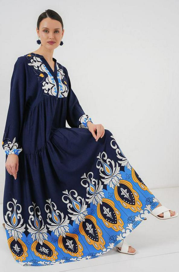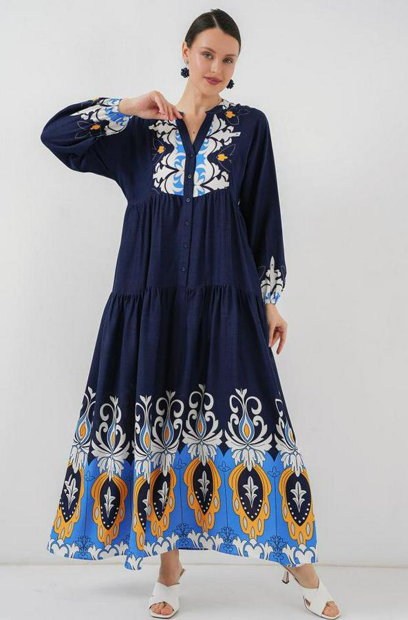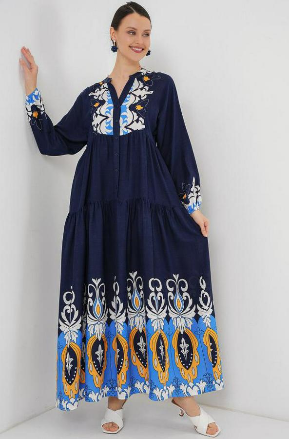 2423 Otantik Desenli Tesettür Elbise - Lacivert 4
