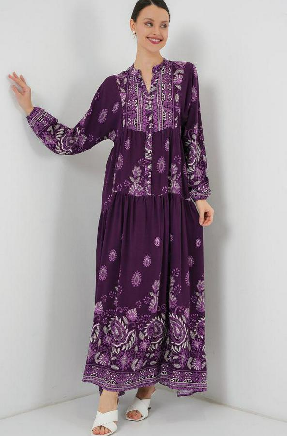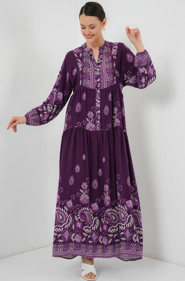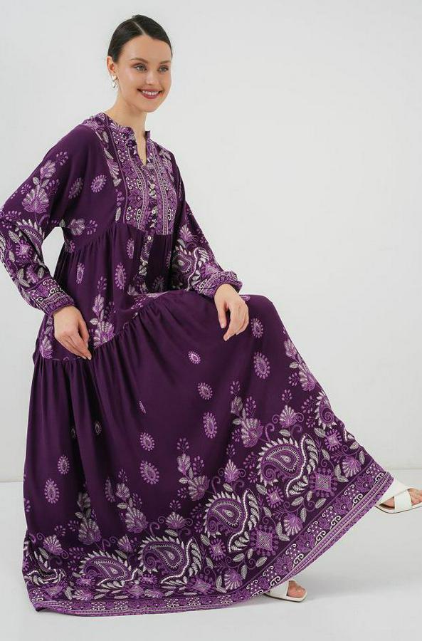 2423 Otantik Desenli Tesettür Elbise - Y. Mor