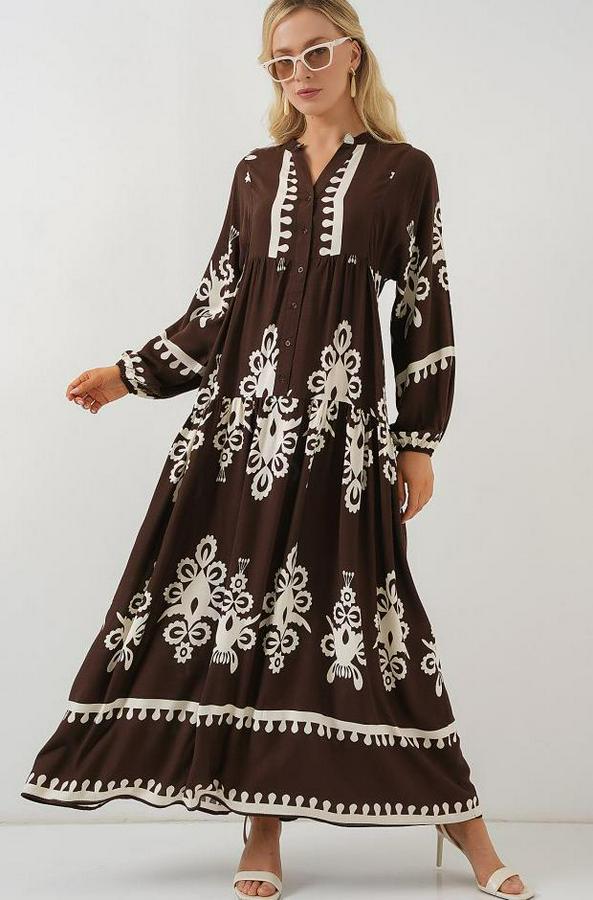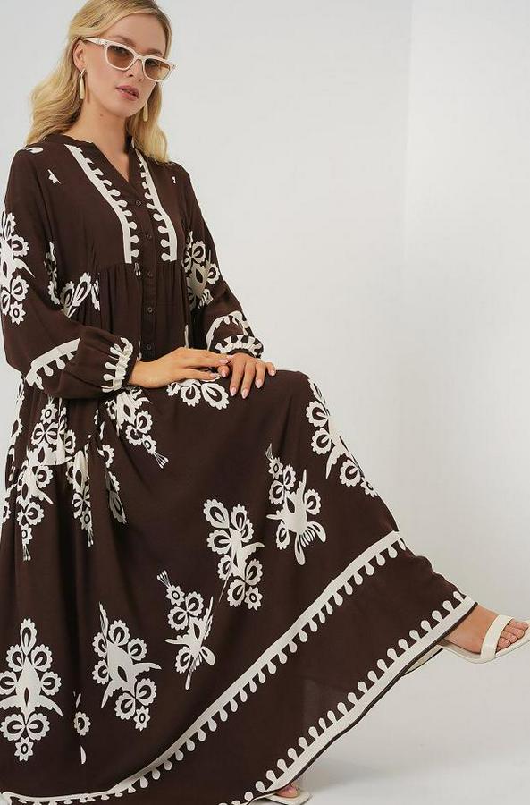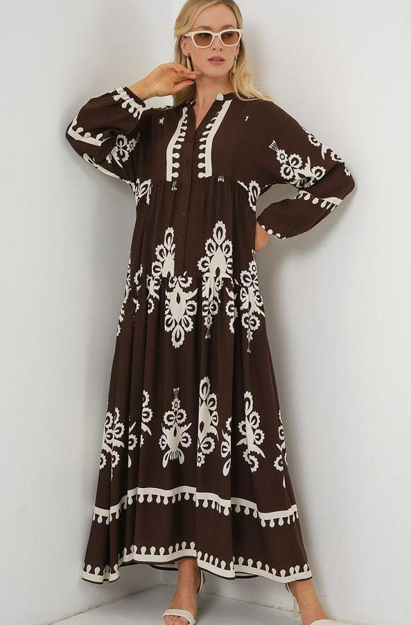 2423 Otantik Desenli Tesettür Elbise - Koyu Kahve