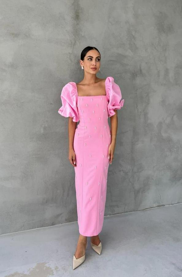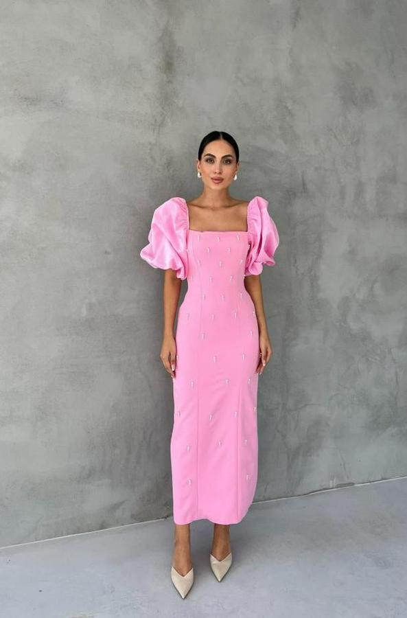 AnasayfaTüm ÜrünlerElbisePembe Işlemeli Kolu Garnili Elbise