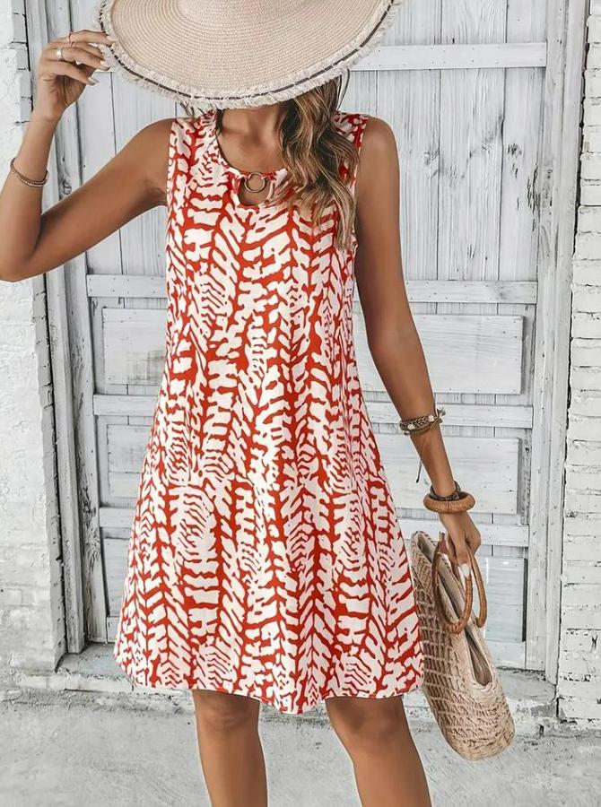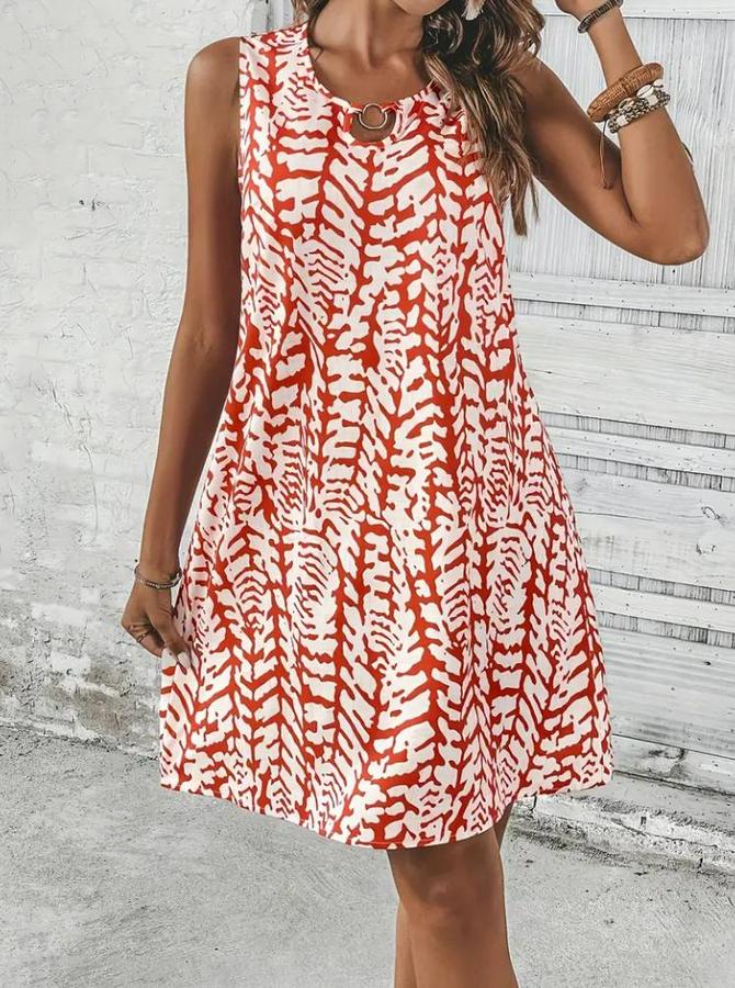 Sıfır Kol Yakadan Halka Detaylı Desenli Kısa Bürümcük Elbise