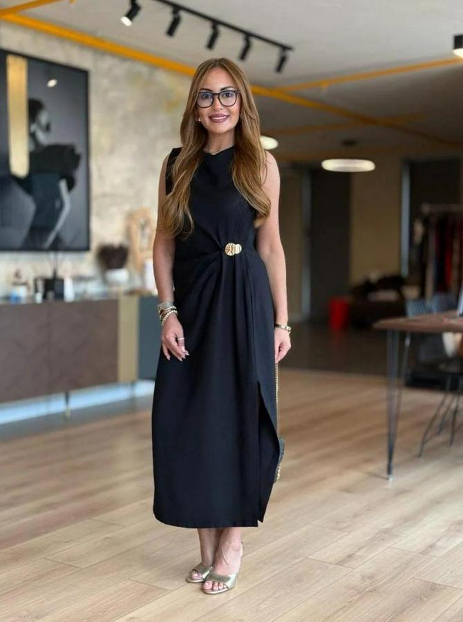 AnasayfaTüm ÜrünlerElbiseSıfır Kollu Bisiklet Yaka Belden Büzgülü Yırtmaç Detaylı Janjan Krep Elbise
