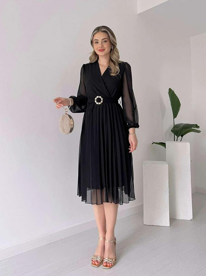 AnasayfaTüm ÜrünlerElbiseŞifon Kumaş Astalı Kloş Kesim Kruvaze Yaka Midi Boy Elbise