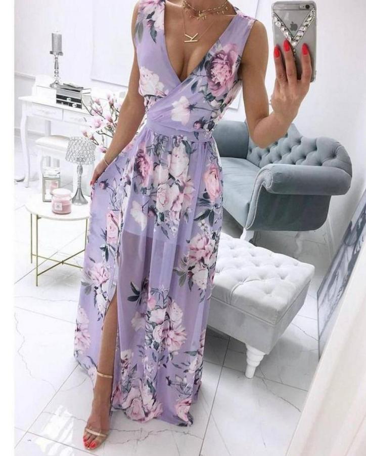 Kadın şifon Kumaş V Yaka Sıfır Kol Maxi Boy Elbise