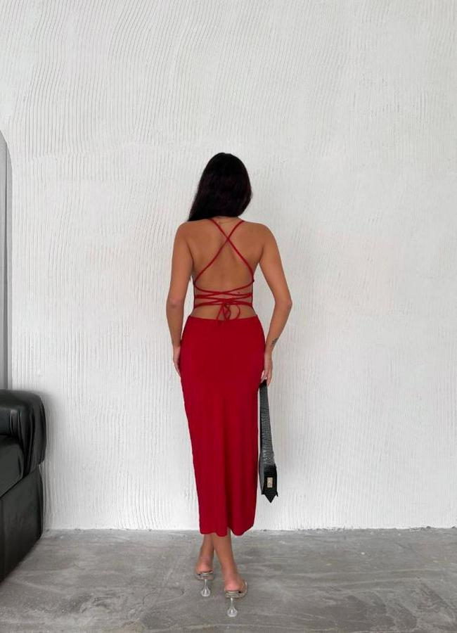 Sırt Bağlamalı Derin Yirtmaç Askılı Elbise - Kırmızı