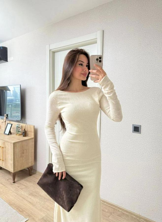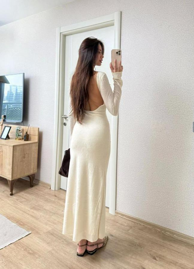 Sırt Dekolteli Uzun Kollu Elbise - Kırık Beyaz