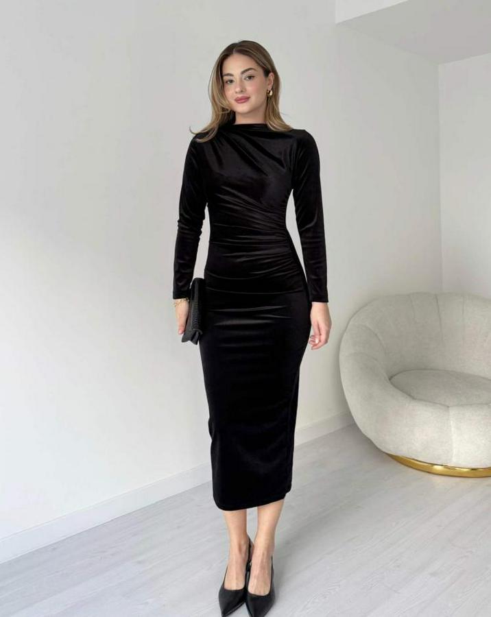 Siyah Uzun Kollu Büzgü Detay Kadife Kumaş Midi Boy Elbise