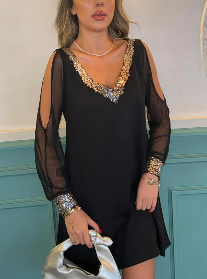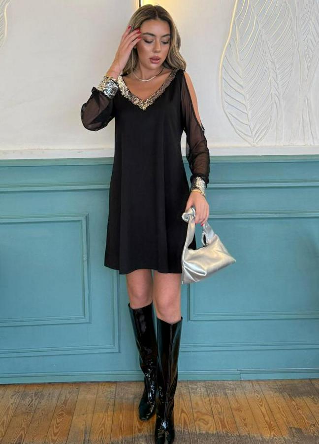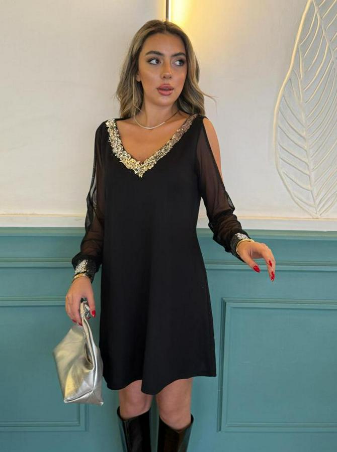 AnasayfaTüm ÜrünlerElbiseSiyah Uzun Kollu Kollar Tül Yırtmaçlı V Yakalı Kısa Krep Elbise
