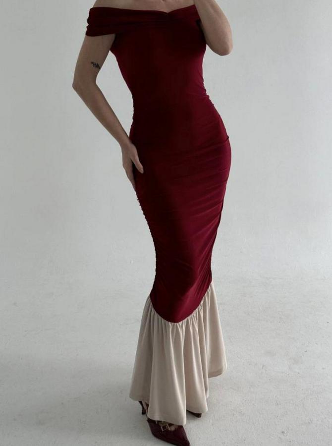 Striptiz Omuzlu Uzun Elbise- Bordo