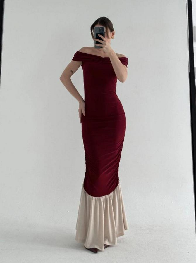 AnasayfaTüm ÜrünlerElbiseStriptiz Omuzlu Uzun Elbise- Bordo