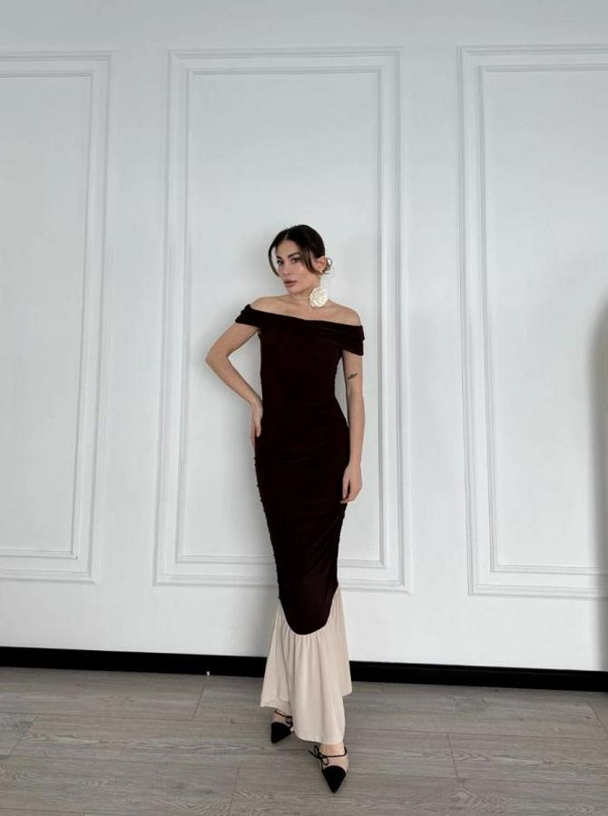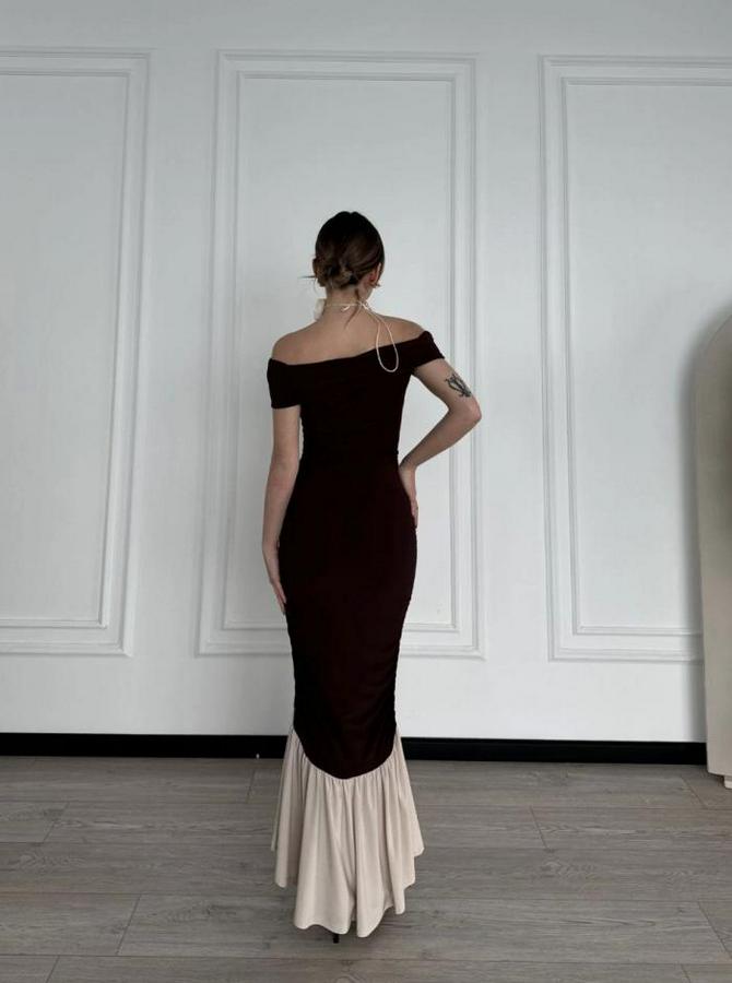 AnasayfaTüm ÜrünlerElbiseStriptiz Omuzlu Uzun Elbise- Kahve