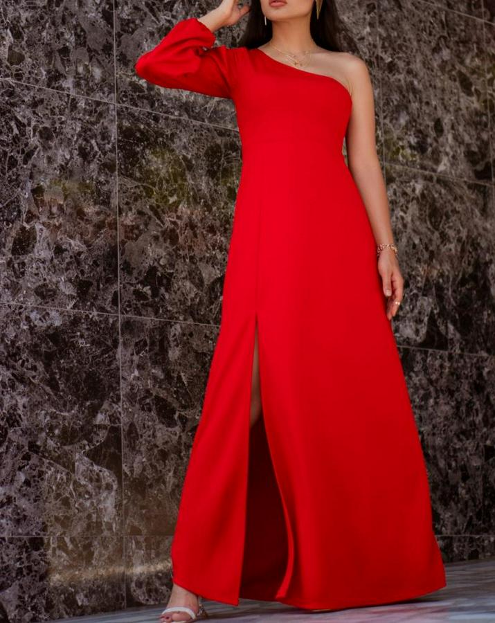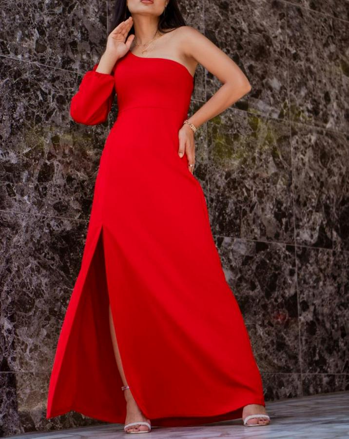 AnasayfaTüm ÜrünlerElbiseTek Omuz Açık Derin Yırtmaçlı Krep Tam Boy Elbise
