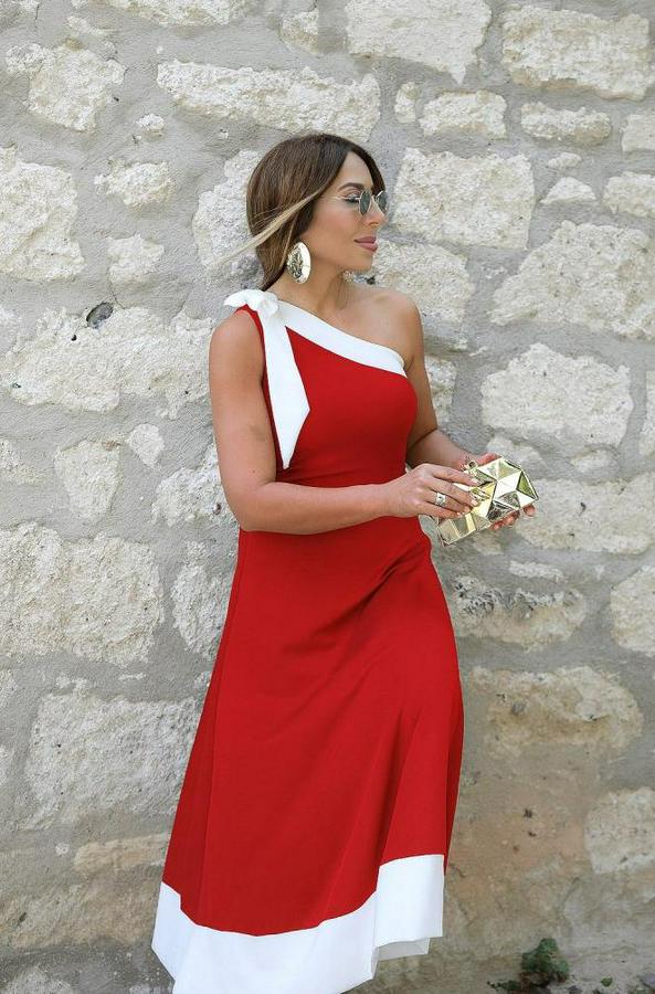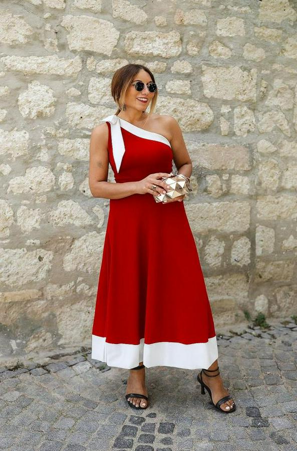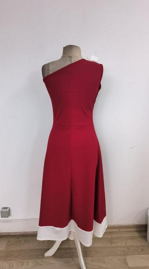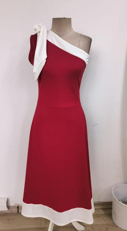 AnasayfaTüm ÜrünlerElbiseTek Omuzu Açık Omuzlardan Kurdela Detaylı Çift Renkli Ithal Krep Elbise