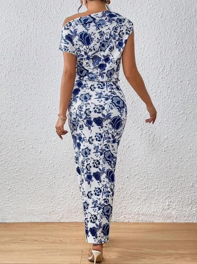 Tek Omuzu Açık Yırtmaçlı Çiçek Desenli Süprem Elbise