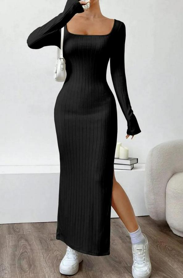 AnasayfaTüm ÜrünlerElbiseTrend U Yaka Yırtmaçlı Uzun Kol Kalın Fitili Elbise