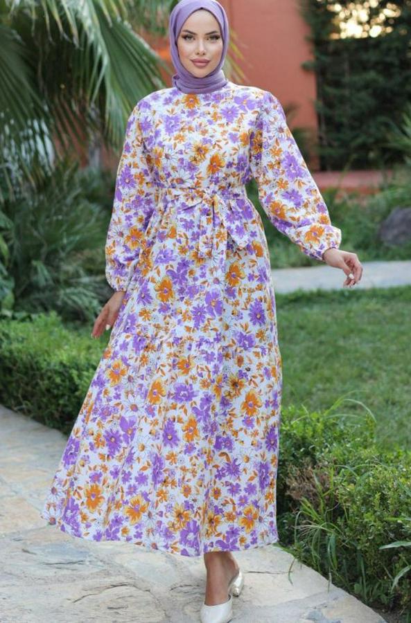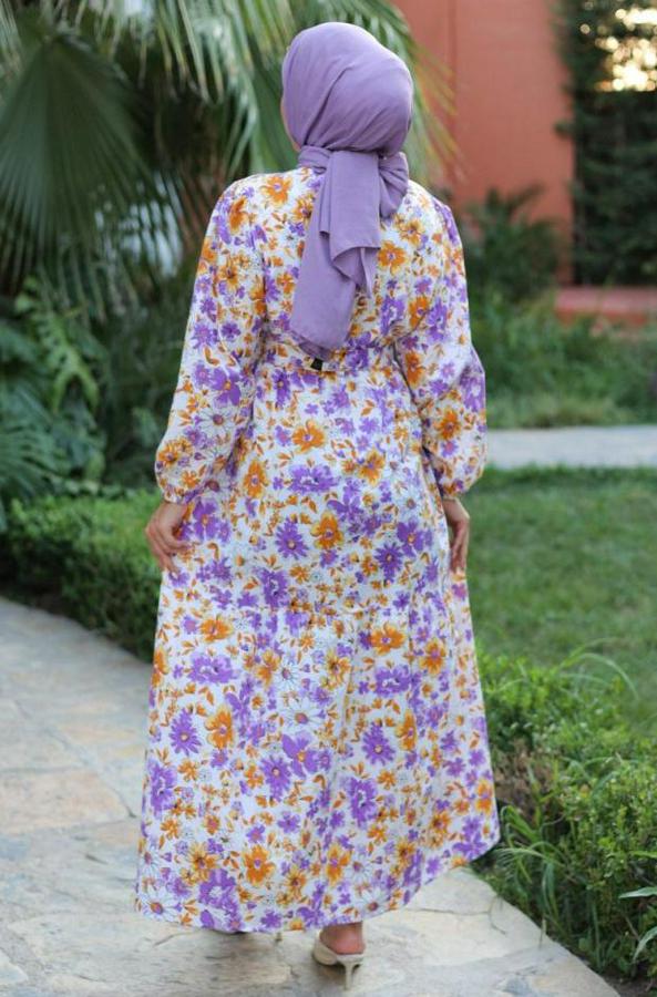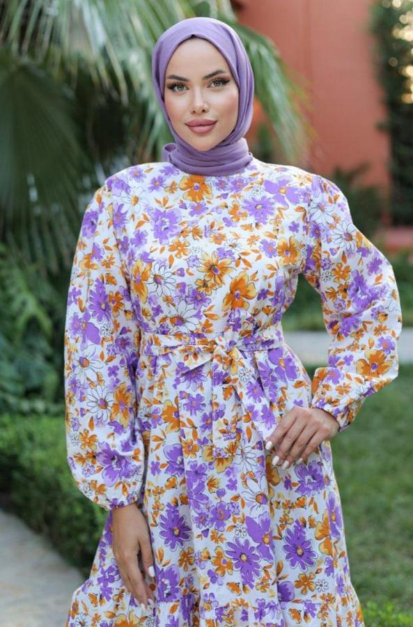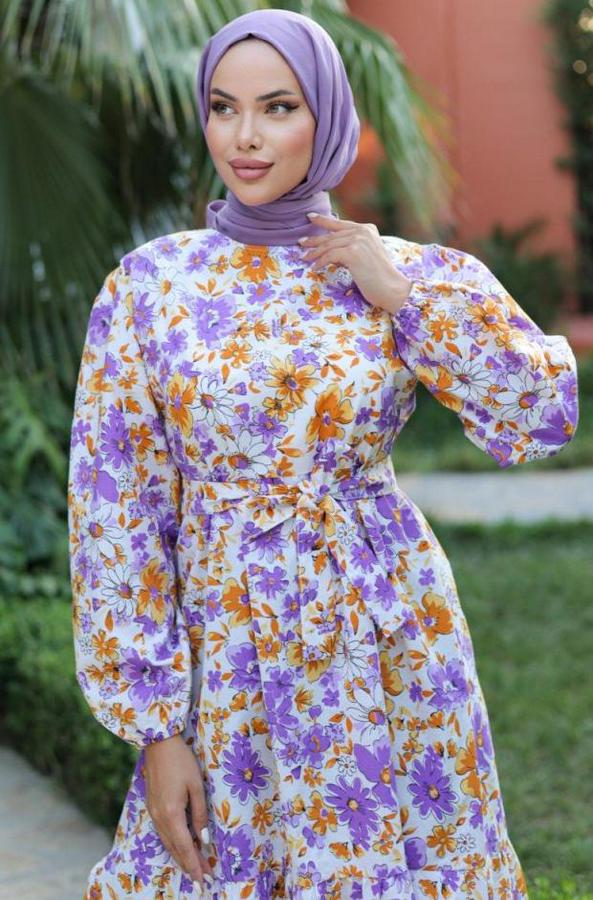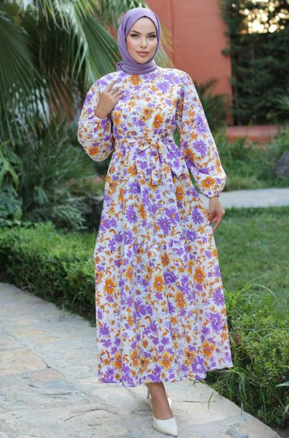 AnasayfaTüm ÜrünlerElbiseUzun Çiçek Yaprak Desenli Belden Bağlamalı Elbise