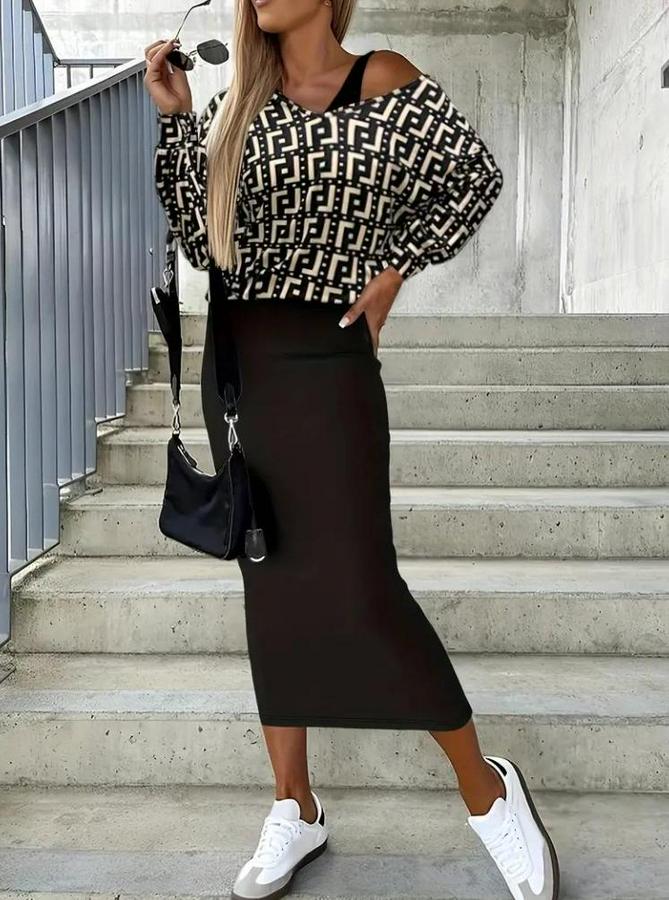 Kadın Uzun Kollu Askılı Yuvarlak Yakalı Yırtmaçlı Dalgıç Elbise Ile Yakalı Yunan Desenli Bluz Ikili Takım