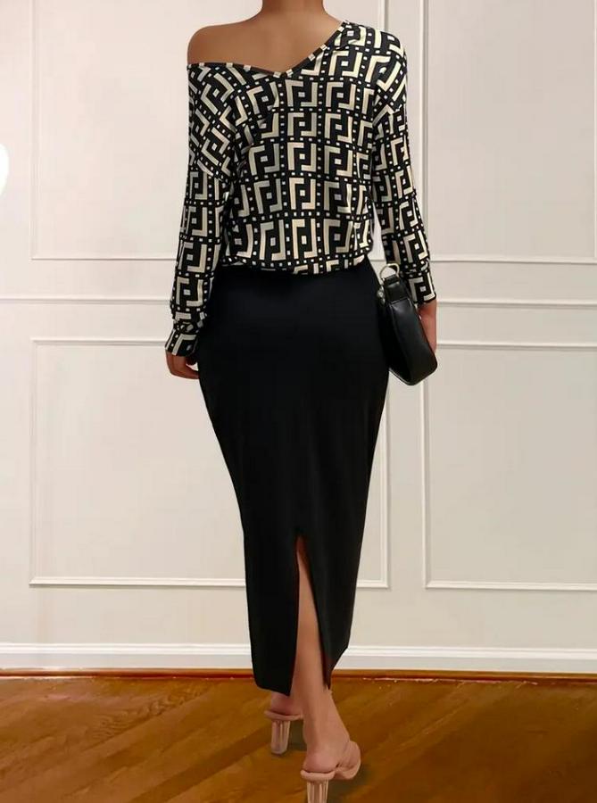Uzun Kollu Askılı Yuvarlak Yakalı Yırtmaçlı Dalgıç Elbise Ile Yakalı Yunan Desenli Bluz Ikili Takım