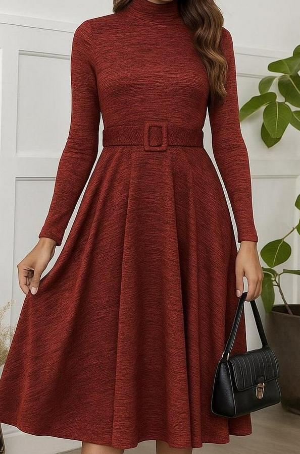 Uzun Kollu Balıkçı Yaka Kemer Detaylı Yumoş Midi Elbise