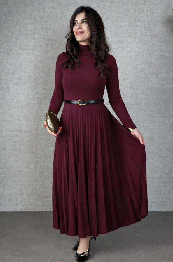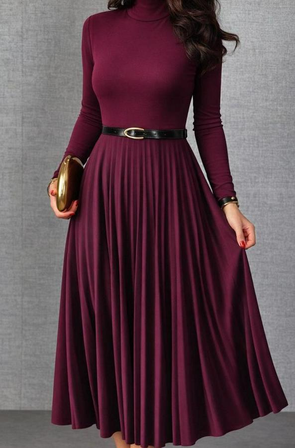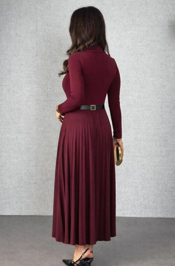 AnasayfaTüm ÜrünlerElbiseUzun Kollu Balıkçı Yaka Kemersiz Pileli Uzun Sandy Elbise