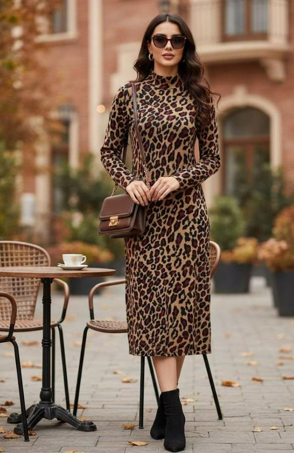 Uzun Kollu Balıkçı Yaka Leopar Desenli Midi Boy Elbise