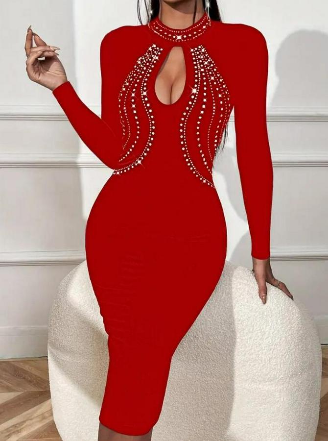Kadın Uzun Kollu Balıkçı Yaka Taşlı Damla Detay Midi Ithal Krep Elbise