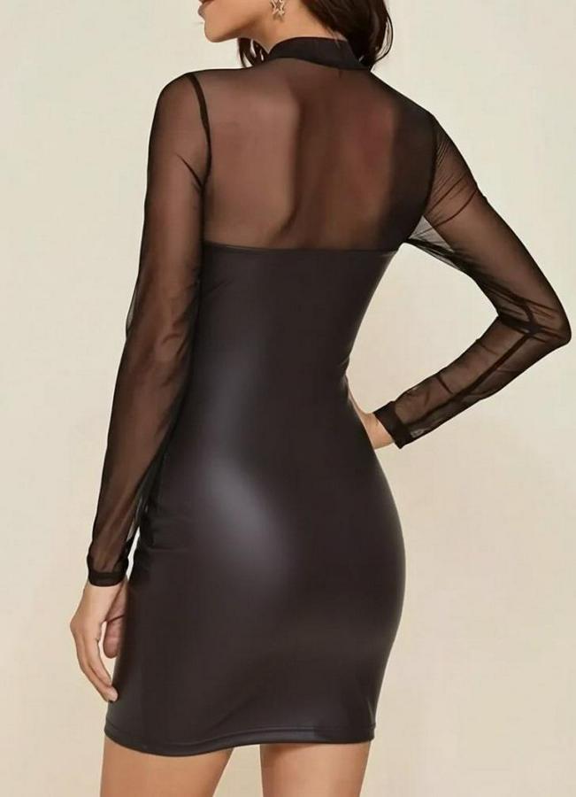 Uzun Kollu Balıkçı Yaka Tül Detaylı Mini Deri Elbise