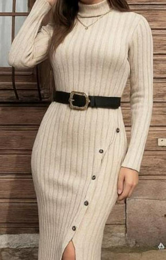Uzun Kollu Balıkçı Yaka Yırtmaçlı Düğmeli Şardonlu Kaşkorse Elbise