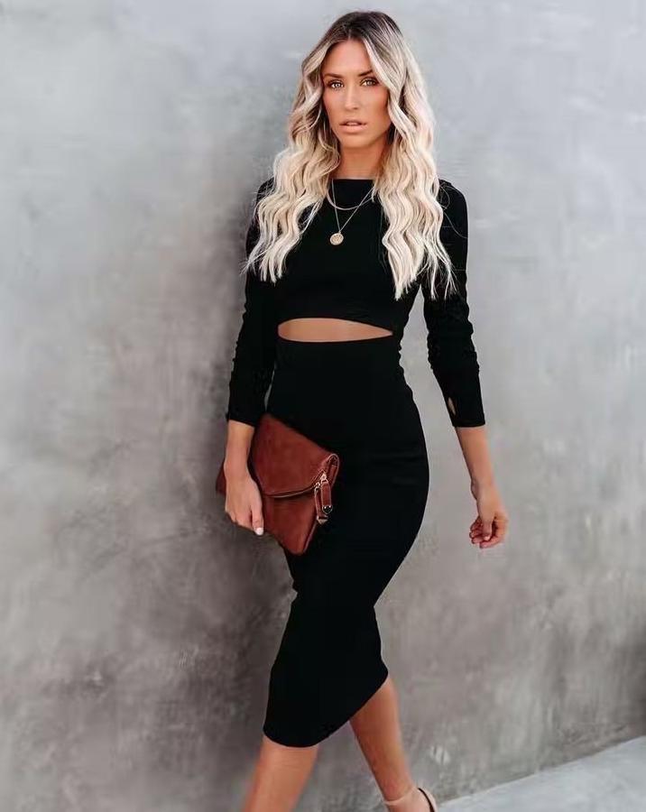 Uzun Kollu Bisiklet Yaka Bel Dekolteli Krep Midi Boy Elbise