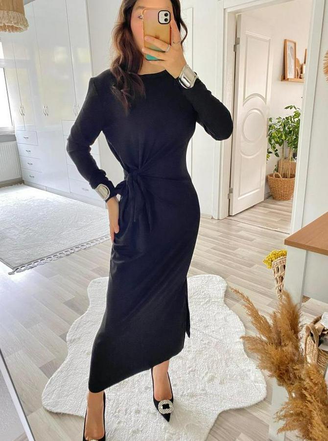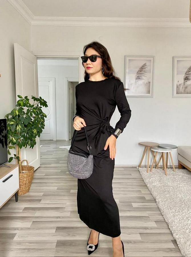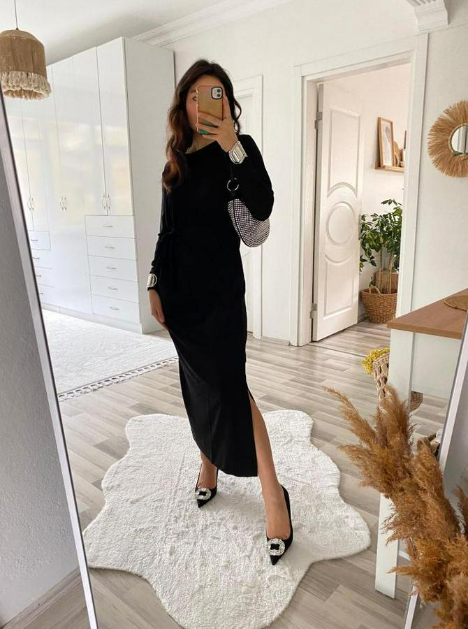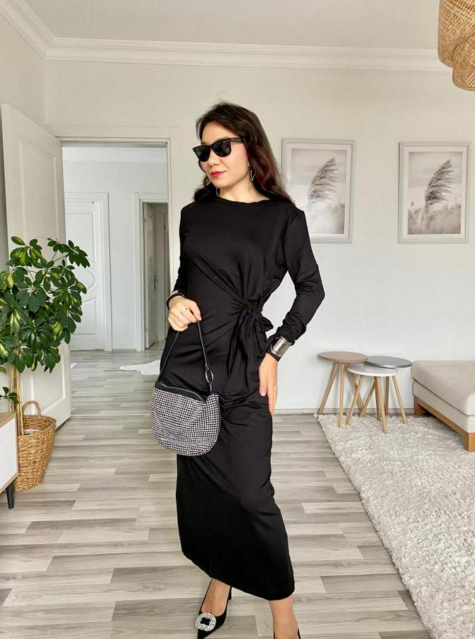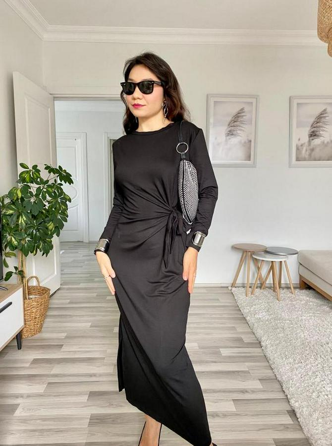 AnasayfaTüm ÜrünlerElbiseUzun Kollu Bisiklet Yaka Belden Çapraz Bağlamalı Yandan Yırtmaçlı Uzun Viskon Iki Iplik Elbise