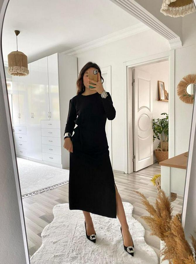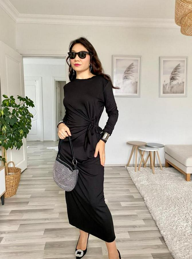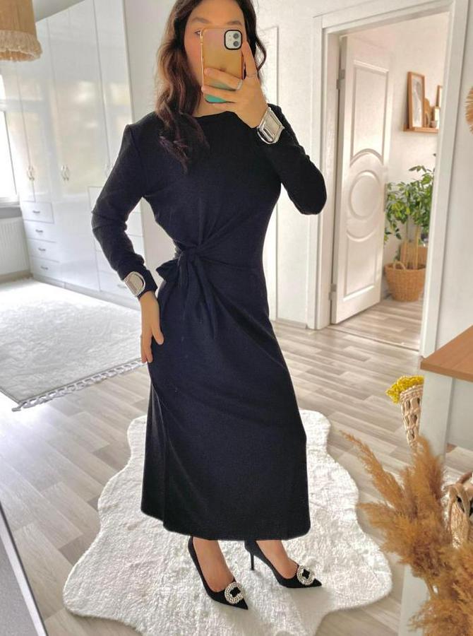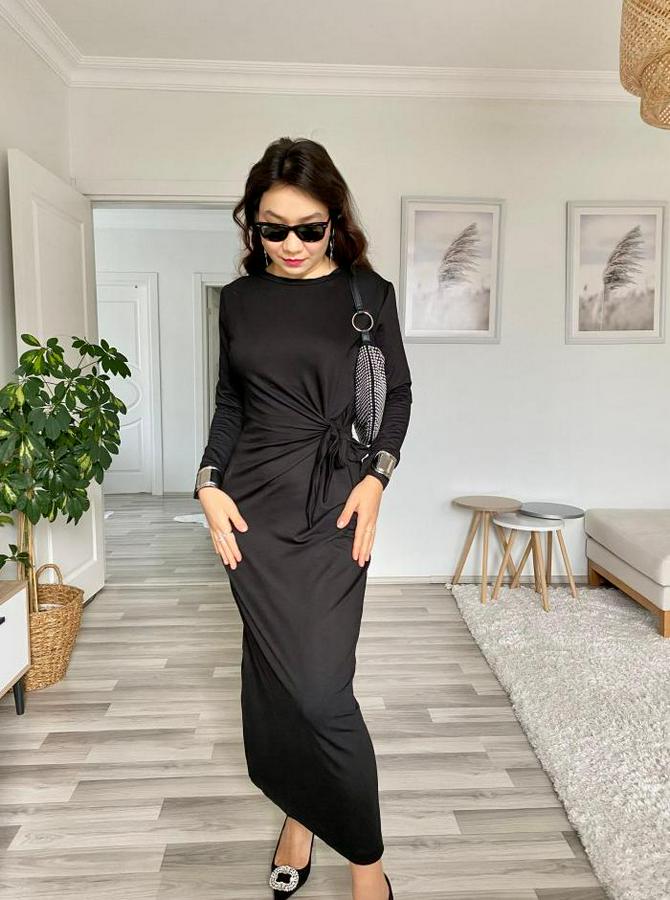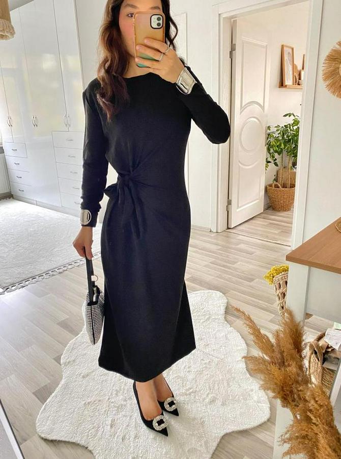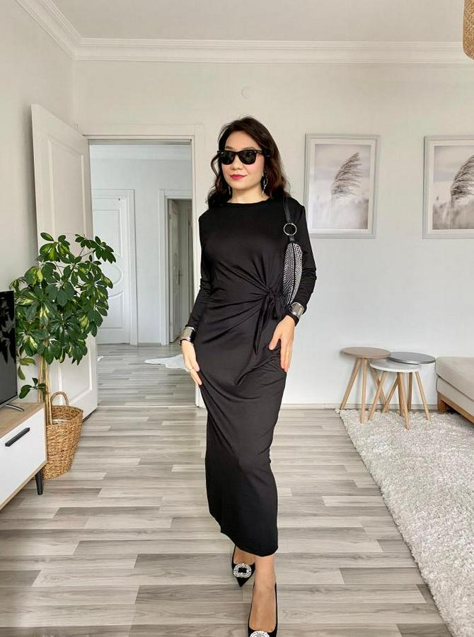 AnasayfaTüm ÜrünlerElbiseUzun Kollu Bisiklet Yaka Belden Çapraz Bağlamalı Yandan Yırtmaçlı Uzun Viskon Iki Iplik Elbise