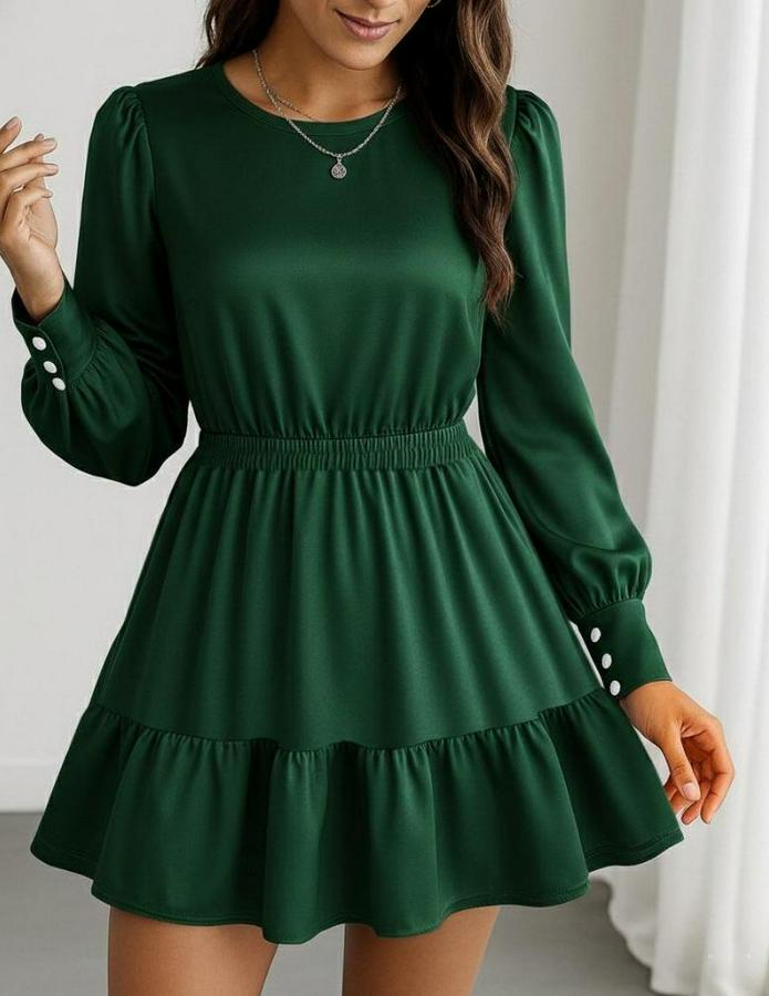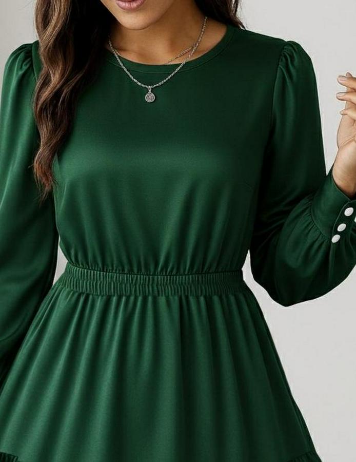 AnasayfaTüm ÜrünlerElbiseUzun Kollu Bisiklet Yaka Beli Lastikli Fırfırlı Ithal Krep Elbise