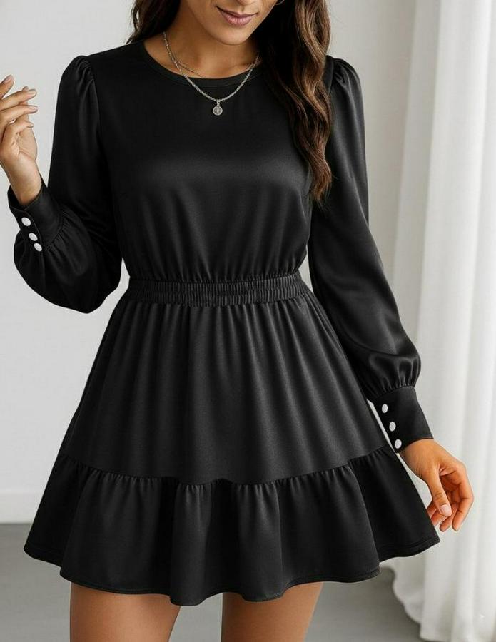 AnasayfaTüm ÜrünlerElbiseUzun Kollu Bisiklet Yaka Beli Lastikli Fırfırlı Ithal Krep Elbise