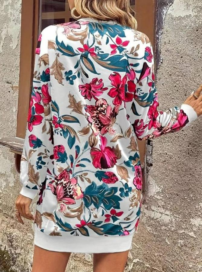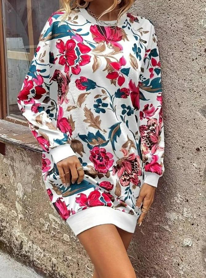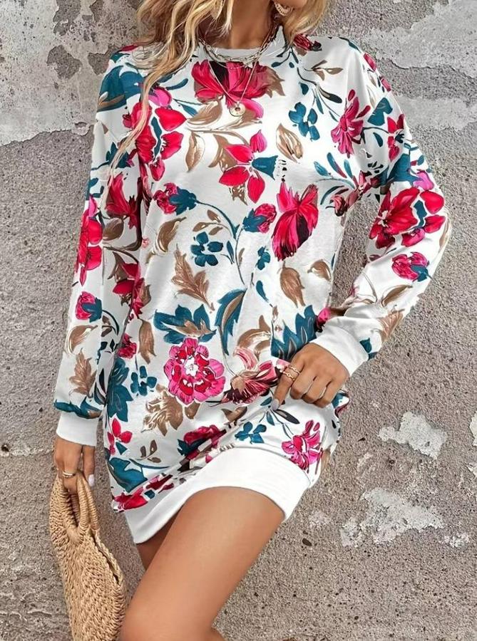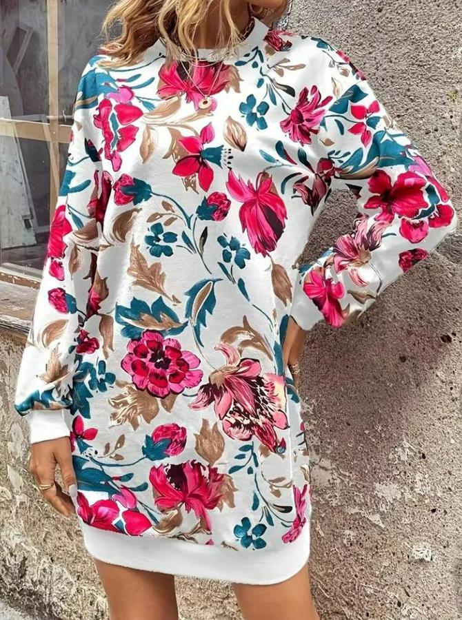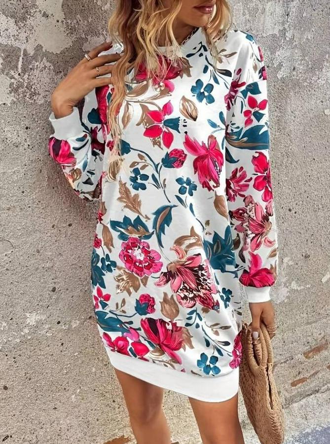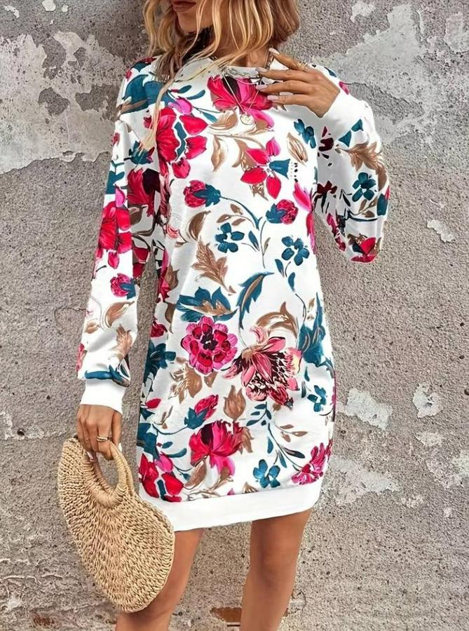 AnasayfaTüm ÜrünlerElbiseUzun Kollu Bisiklet Yaka Çiçek Baskılı Şardonlu Dalgıç Elbise