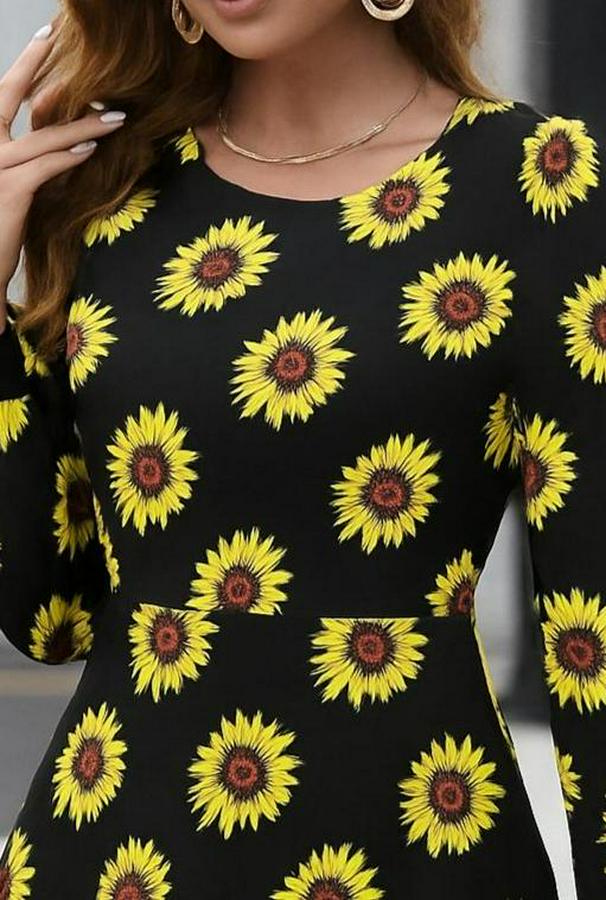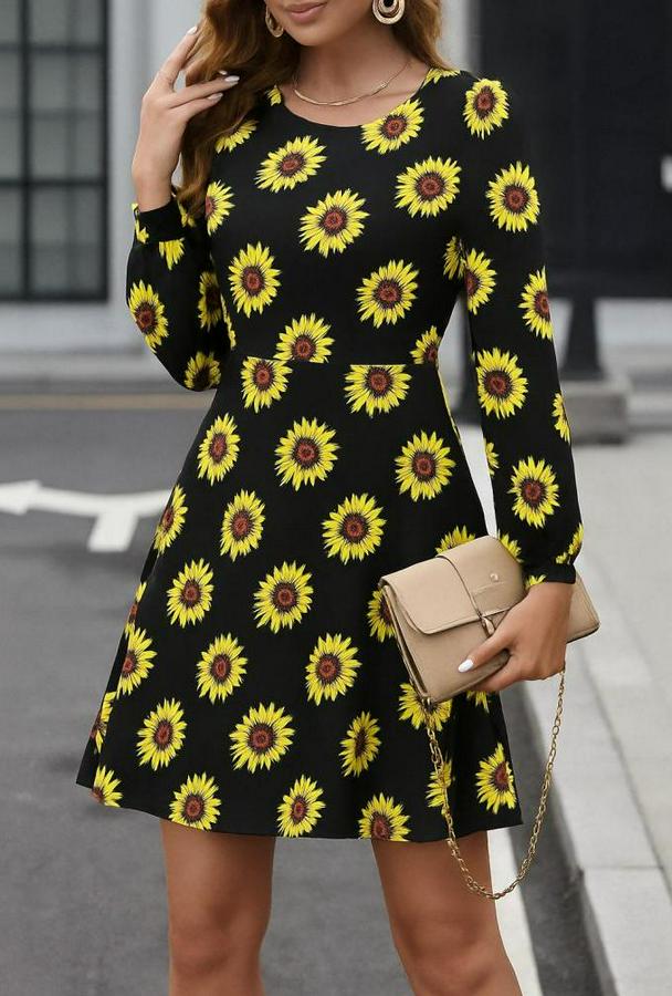 Kadın Uzun Kollu Bisiklet Yaka Desenli Kısa Krep Elbise