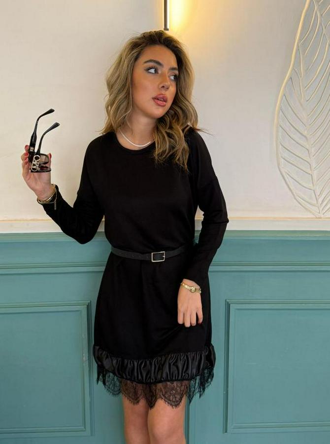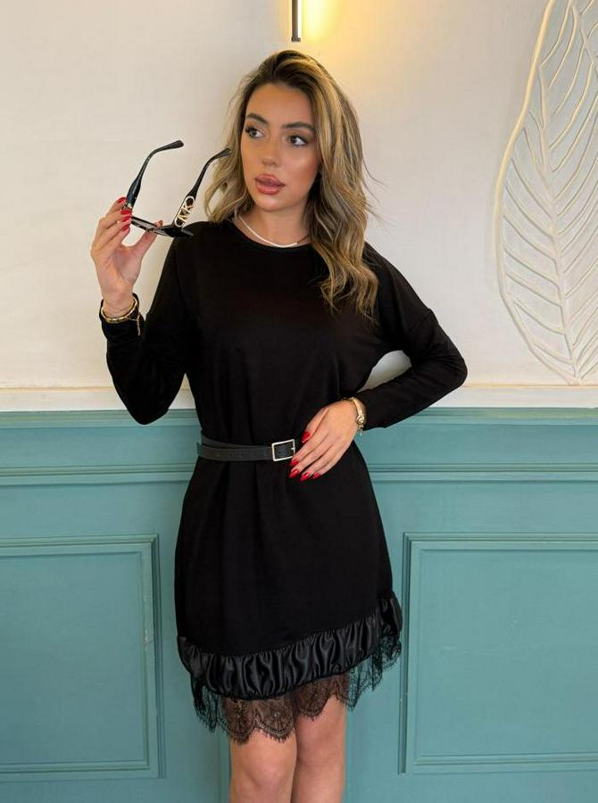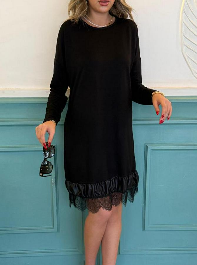 AnasayfaTüm ÜrünlerElbiseUzun Kollu Bisiklet Yaka Etek Ucu Deri Ve Tül Detay Iki Iplik Mini Boy Elbise