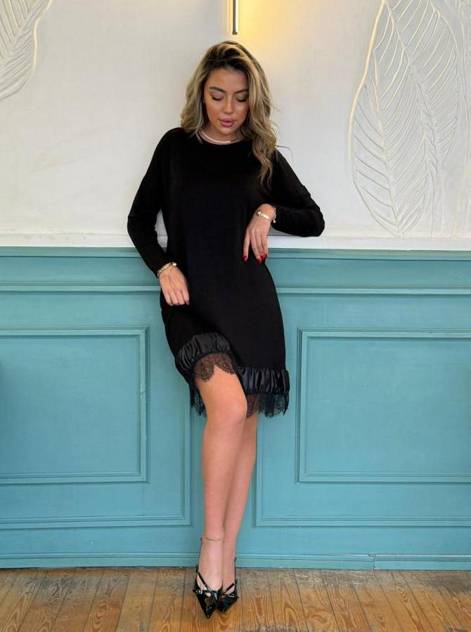 Kadın Uzun Kollu Bisiklet Yaka Etek Ucu Deri Ve Tül Detay Iki Iplik Mini Boy Elbise
