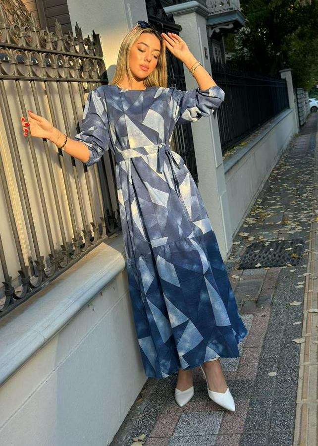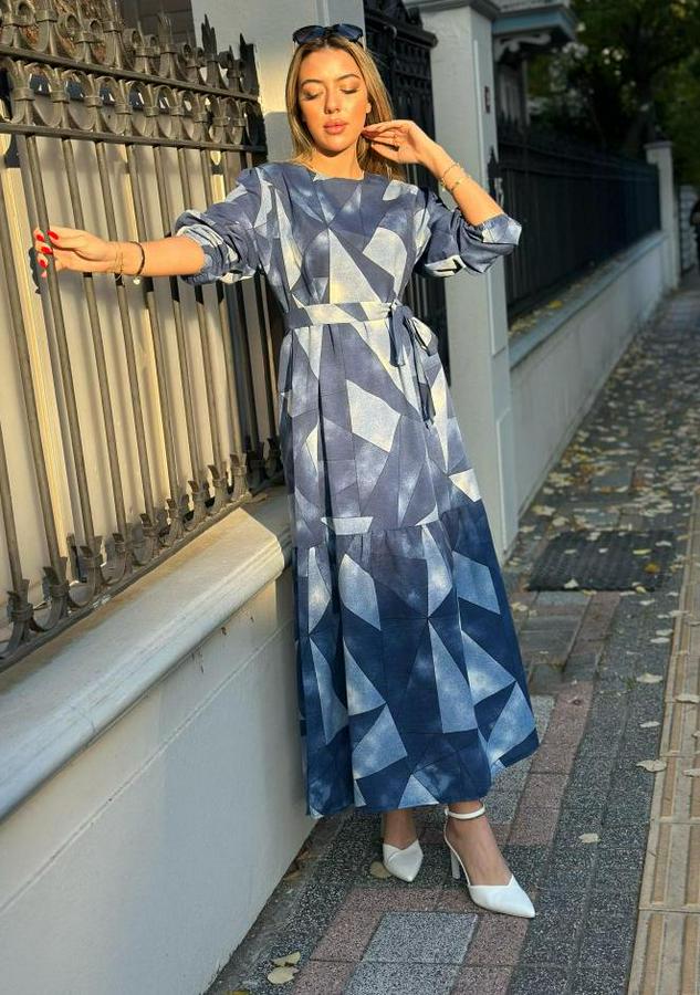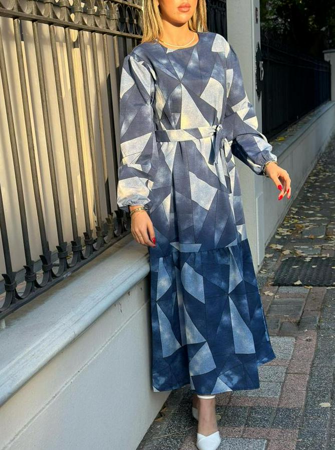 AnasayfaTüm ÜrünlerElbiseUzun Kollu Bisiklet Yaka Geometrik Desen Baskılı Kuşak Dahil Maxi Boy Elbise