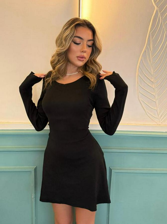 Uzun Kollu Bisiklet Yaka Kısa Kaşkorse Elbise