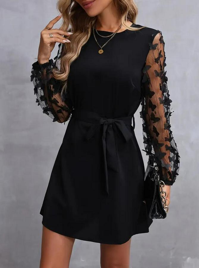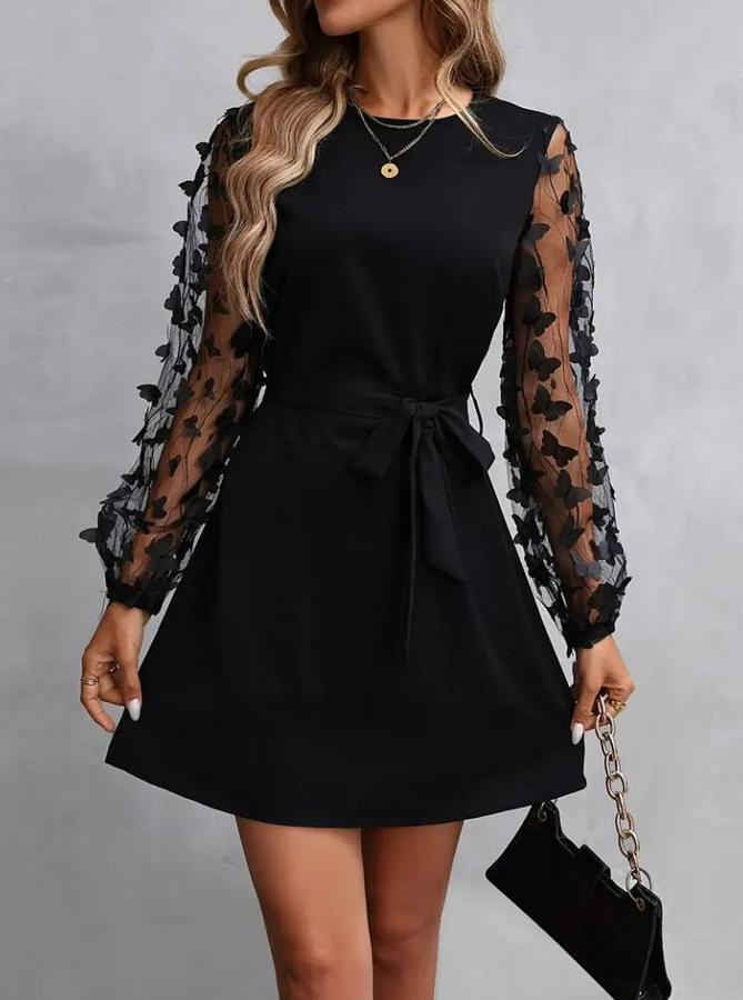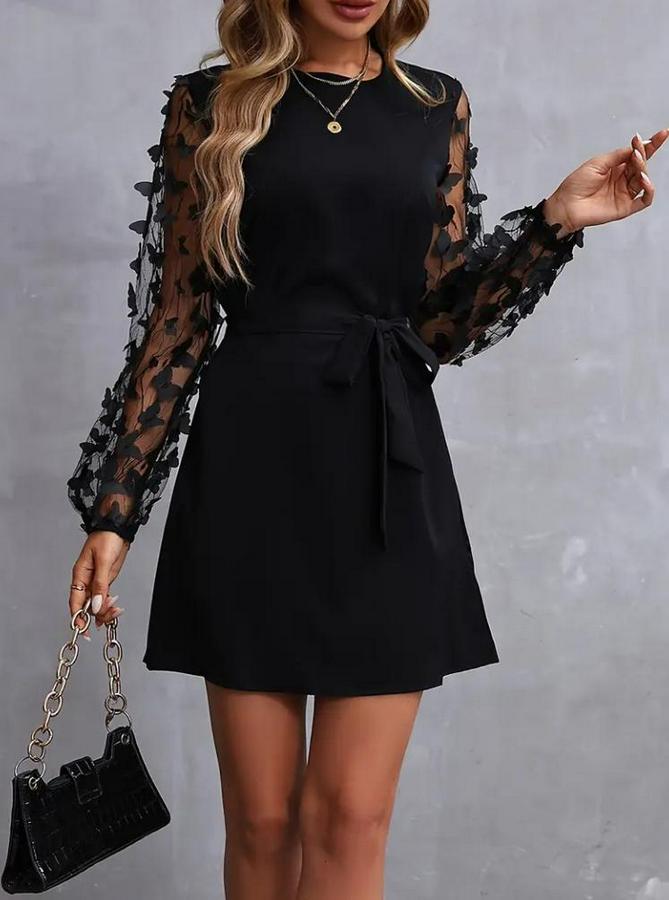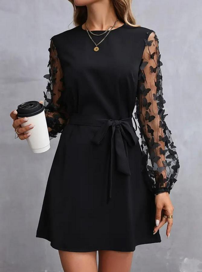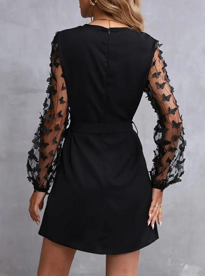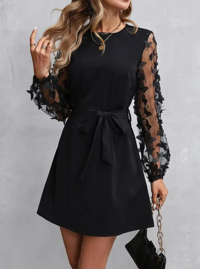 AnasayfaTüm ÜrünlerElbiseUzun Kollu Bisiklet Yaka Kollar Tül Kelebek Detaylı Ithal Krep Elbise