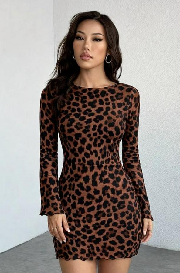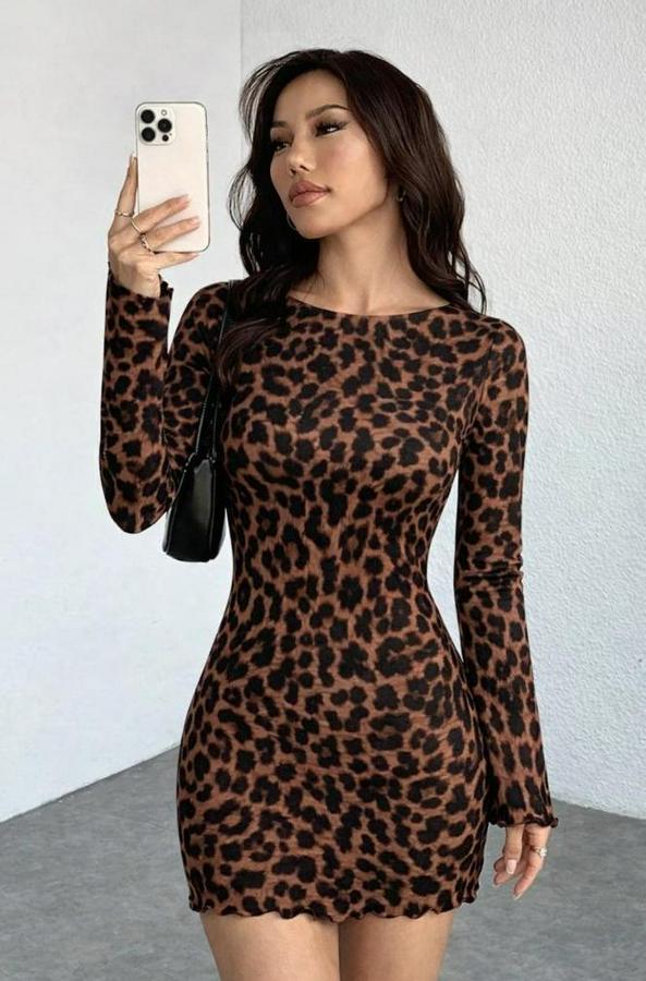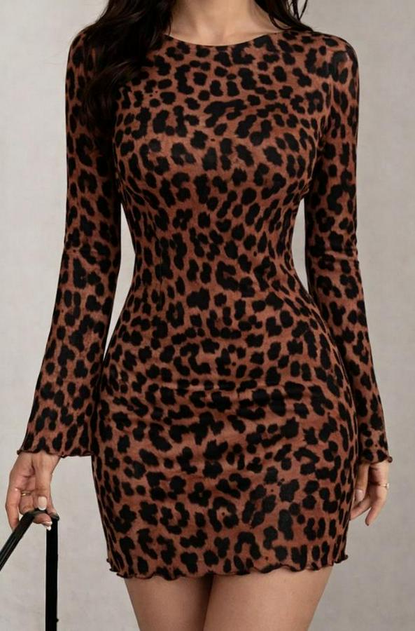 AnasayfaTüm ÜrünlerElbiseUzun Kollu Bisiklet Yaka Leopar Desenli Dalgıç Mini Elbise