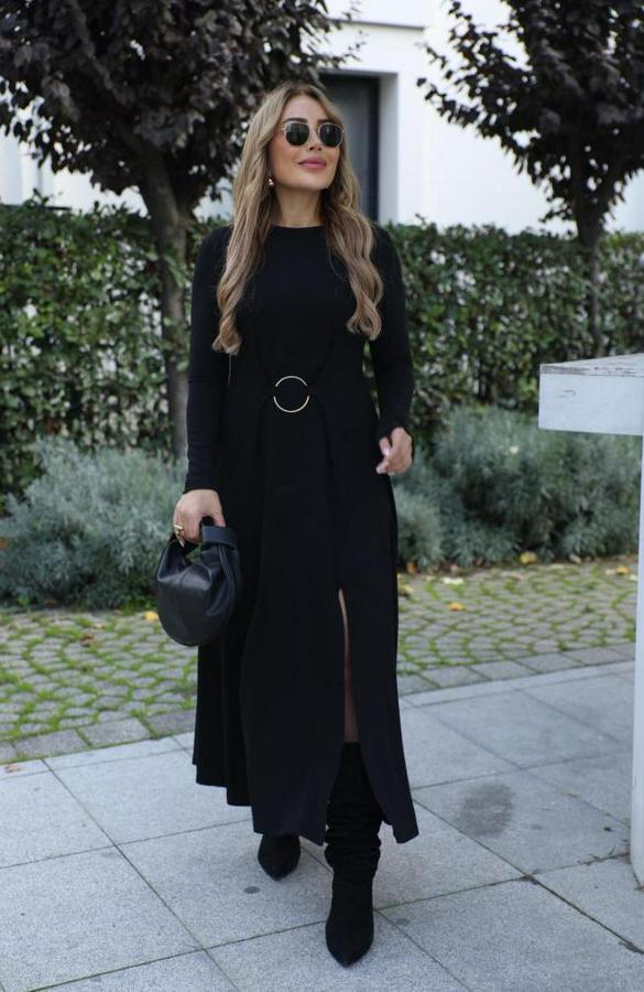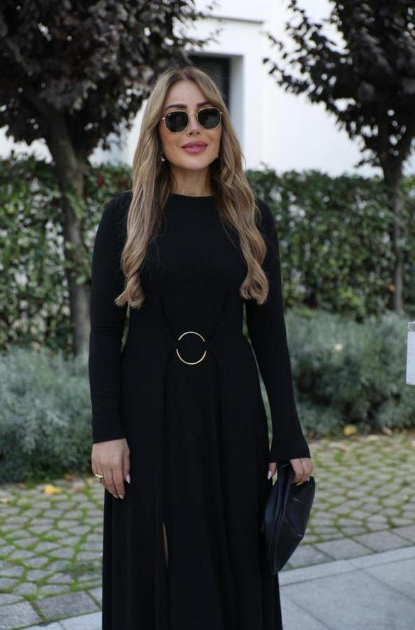 AnasayfaTüm ÜrünlerElbiseUzun Kollu Bisiklet Yaka Önden Halka Detaylı Yırtmaçlı Uzun Viskon Iki Iplik Elbise