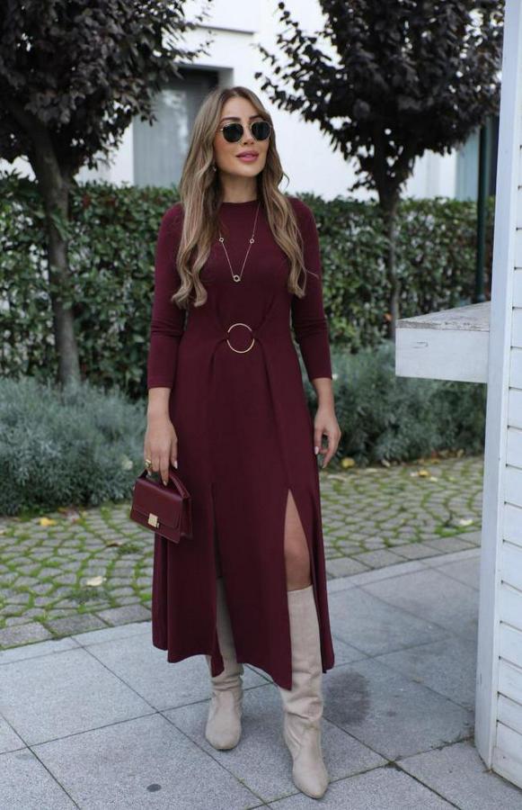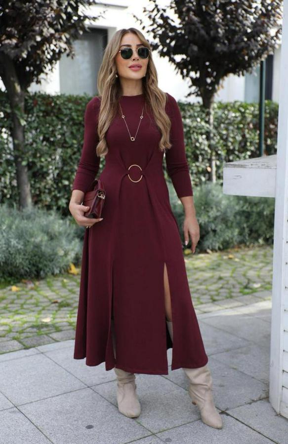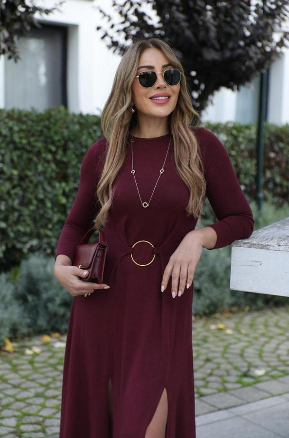AnasayfaTüm ÜrünlerElbiseUzun Kollu Bisiklet Yaka Önden Halka Detaylı Yırtmaçlı Uzun Viskon Iki Iplik Elbise