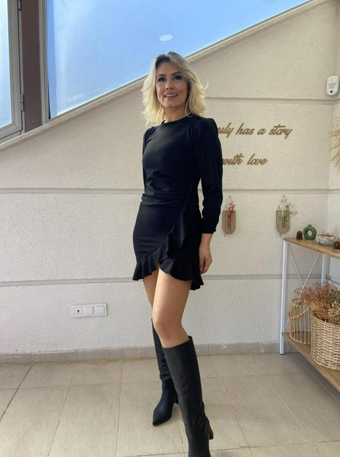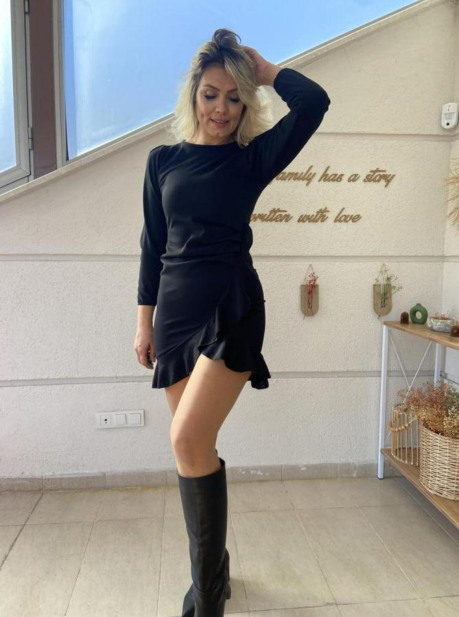 AnasayfaTüm ÜrünlerElbiseUzun Kollu Bisiklet Yaka Önden Volanlı Ithal Krep Elbise