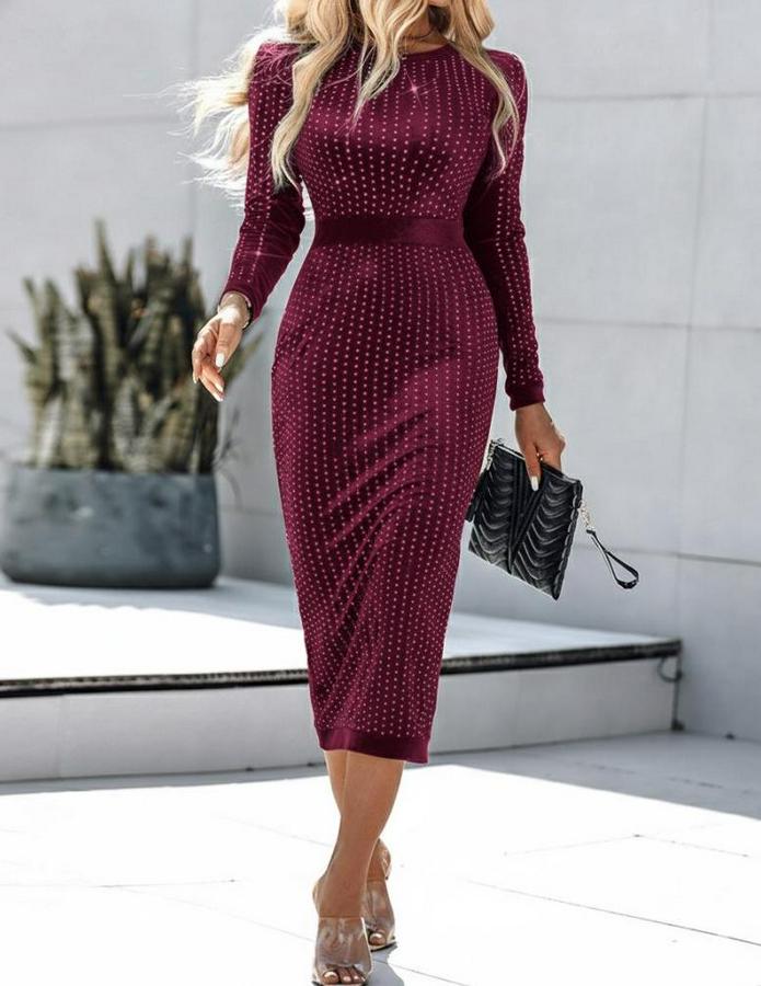 Uzun Kollu Bisiklet Yaka Taşlı Midi Kadife Elbise