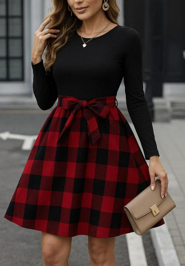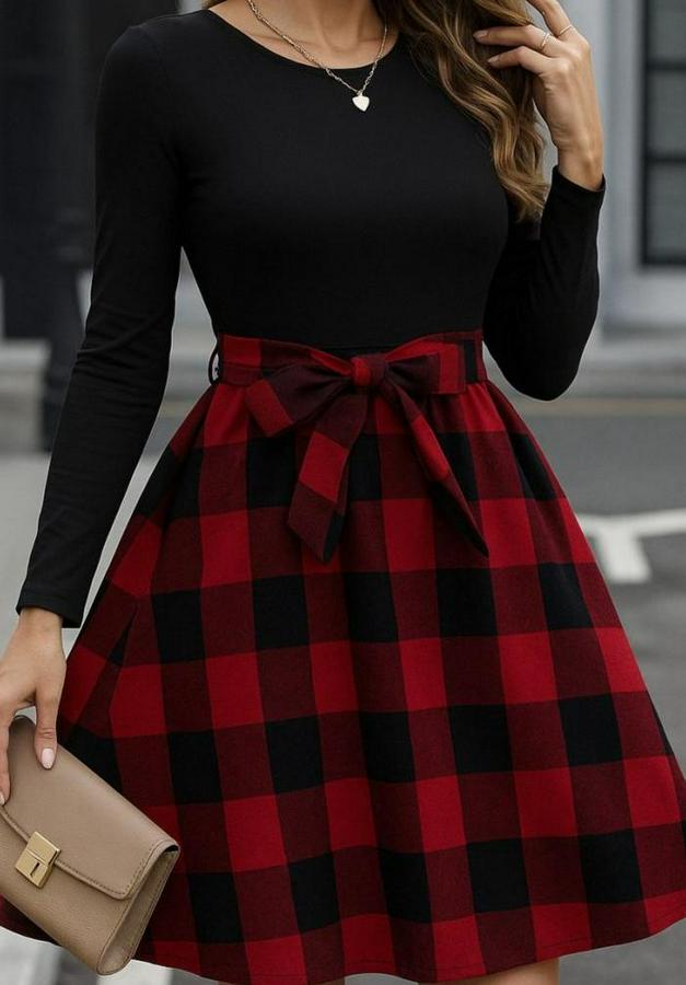AnasayfaTüm ÜrünlerElbiseUzun Kollu Bisiklet Yaka Üst Viskon Alt Ekose Kısa Elbise