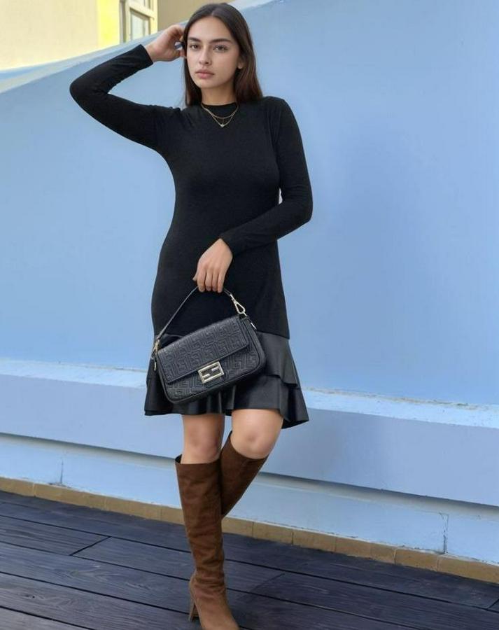 Kadın Uzun Kollu Bisiklet Yaka üst Viskon Etek Ucu Deri Kısa Elbise